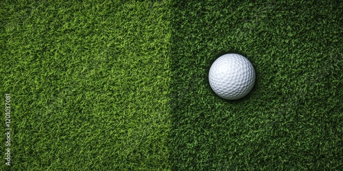 Golf ball positioned on vibrant green grass with a smooth gradient showcasing balance, ample copy space on both sides for text placement