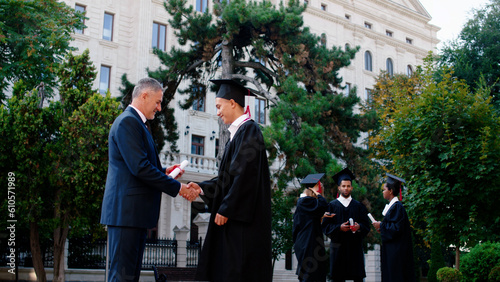 Good looking man college principal in the graduation day giving diploma one of the student then posing together in front of the camera with diploma