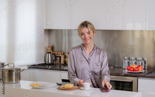 Good morning. Woman sitting in the kitchen in the morning and drinking coffee. Sensual housewife.