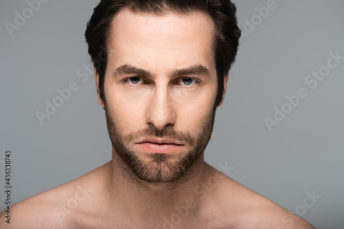 background, isolated, young, adult, beauty, caucasian, well-being, face, care, man, grey, skin, skincare, body, clean, purity, grey, shirtless, honed, photogenic, wellness, bodycare, good-looking, bearded, copy space, one person, studio shot