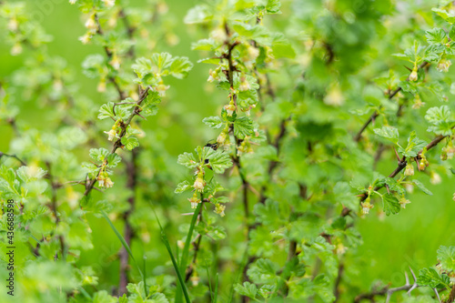 bumblebee, gooseberry, spring, pollination, warming, nature, ecology, green, flowering, bush, leaf, berry, gardening, agriculture, tree branch