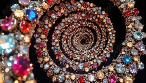 gorgeous complex spiral of diamonds and gemstones unwinding, top view