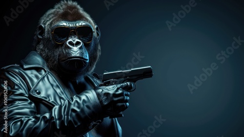 Gorilla wearing leather jacket and sunglasses and holding a gun on dark blue background, copy space