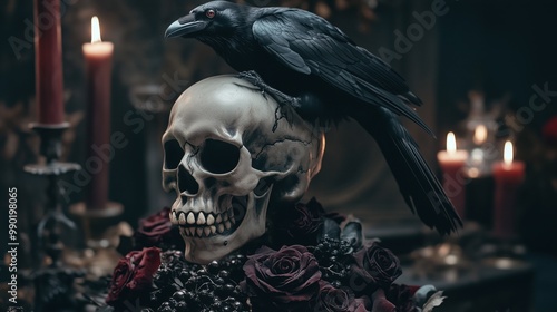 Gothic Halloween scene with skull, raven. Goth designs mockup with dark creepy background. Elegant vintage style with horror aged elements