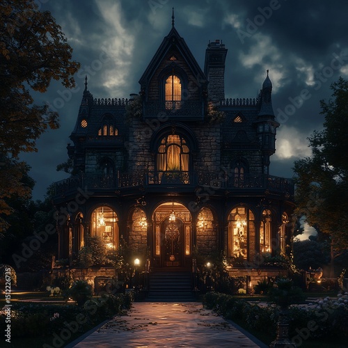 Gothic mansion at night, illuminated by warm light
