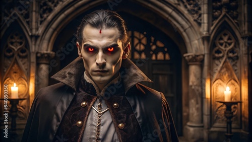 Gothic Vampire in Candlelit Crypt with Piercing Red Eyes