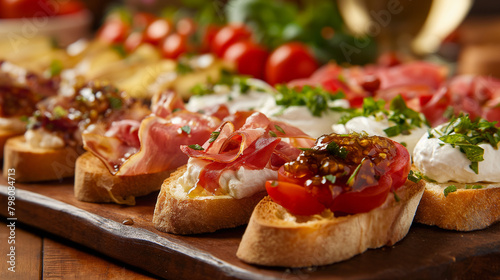 Gourmet bruschetta variety, featuring toppings like prosciutto and fig, ricotta and honey, and traditional tomato and garlic, each piece artfully arranged and highlighted for its unique flavor profile