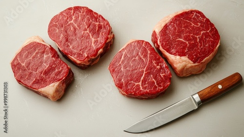 Gourmet Butcher's Cuts Closeup Raw Meat on White Surface with Knife - Culinary Delight for Foodies