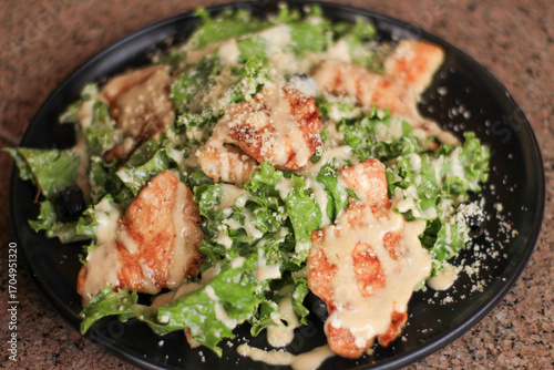 salad, chicken, grilled, caesar, lettuce, romaine, parmesan, cheese, dressing, plate, black, food, meal, lunch, dinner, healthy, fresh, epicure, cookery, protein, greener, leafy, sliced, cooked, homemade, kitchen, table, nourishment, diet, eatery, serving, tasty