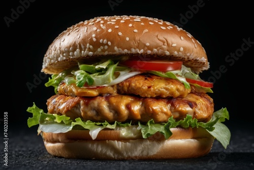 epicure, dark background, sesame seeds, grilled, lettuce, fast food, cheese, tomatoes, high contrast, culinary arts