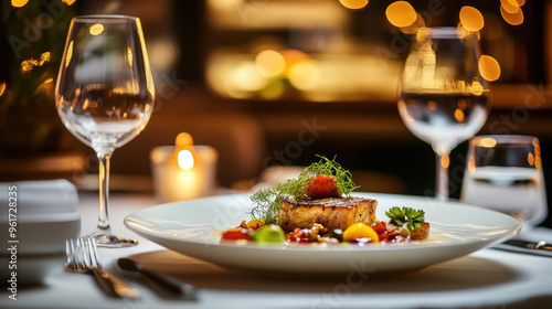 eatery, food, dinner, epicure, fine dining, plate, dish, meal, accessing, seafood, fish, vegetable, wine glass, wine, goggles, candle, table, tablecloth, white, elegant, romantic, celebration, luxury, delicious, fresh, healthy, closeup