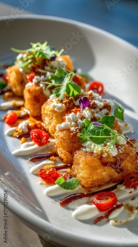 Gourmet Fried Cheese Bites Appetizer Dish with Herbs and Sauce Garnish Delicious Restaurant Food