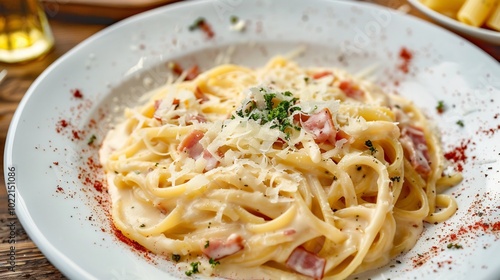 Gourmet Italian pasta dish with creamy carbonara sauce crispy pancetta and freshly grated Parmesan served in a cozy trattoria
