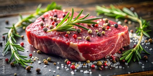 steak, rosemary, peppercorn, raw meat, food photography, gourmet food, cooking, receipe, meat, cookery, delicious, dinner, lunch, eatery, epicure, gastronomy, beef, herb, spice, texture, red meat, closeup, culinary arts, meal, dish, protein, healthy eating, epicure, premium, high-quality, photo