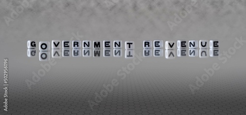 government revenue word or concept represented by black and white letter cubes on a grey horizon background stretching to infinity