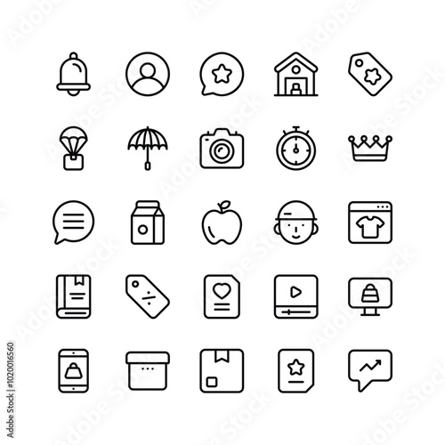notification, bell, user, profile, ranking, rating, warehouse, special offer, logistic, delivery, umbrella, photo, camera, stopwatch, crown, countdown, communication, apple, online, shopping, book, percentage, price tag, favourite, checklist, parcel, package, document, icon, vector