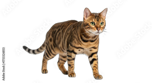 bengal, cat, felino, animal, pet, walking, graceful, studio, white, background, isolated, elegant, domestic, mammal, purebred, spotted, rosette, fur, gaze, eye, portrait, beautiful, sleek, exotic, breed, photo, clean, minimal, motion, stylish, luxury, gold, brown, whisker, tail, paw, confident, majestic, attentive, nature, pure, cat, indoor