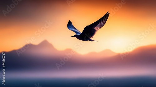 Graceful bird soaring above a mountain range with soft clouds and sunlight