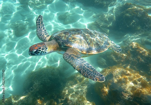 Graceful Sea Turtle Swimming Through Clear Tropical Waters Surrounded by Vibrant Coral and Rocks in a Serene Underwater Environment