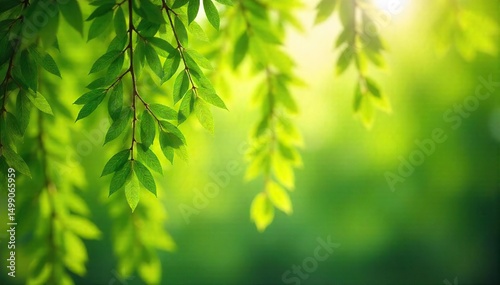 Graceful willow branches draped with delicate, new spring leaves, sunlight filtering through the vibrant green foliage Perfect for spring, nature, and Easter themes , landscape, screensaver