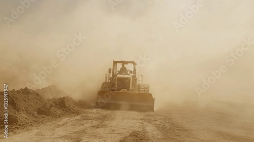 Grader moving earth, dust cloud.