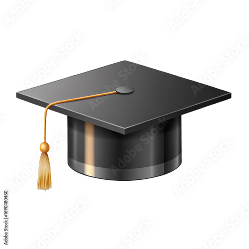 Graduation cap, black, gold tassel, isolated white background