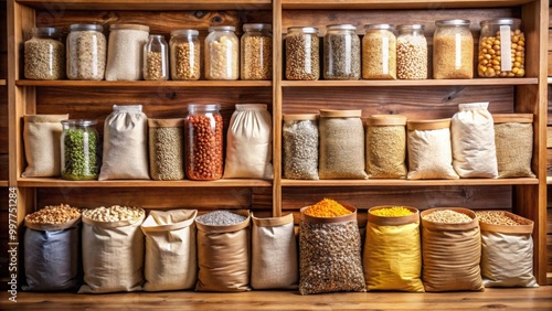 Grain-filled bags and containers neatly arranged on wooden shelves , grains, storage, organic, agriculture, bulk, farming, harvest