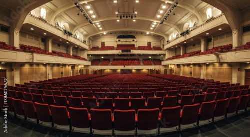 Grand Auditorium Interior - Empty red seats fill a grand auditorium, ready for a performance or event. The architectural details are stunning