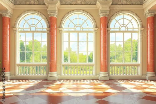 Grand hall with large windows in palace or castle, surrounded by lush greenery