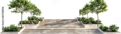 Grand staircase with rising steps, small growing trees beside them, isolated on white background, copy space