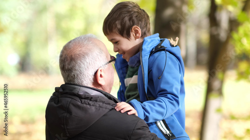 Grandfather and little grandson walking in the autumn park. soft selective focus
