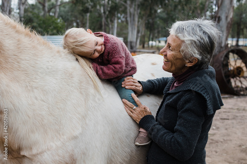 affection, animal, apparel, daylight, elder, elderly, equine, facial expression, family, finger, footwear, grandchild, grandmother, grandmother, horse, hug, human face, interaction, love, outdoors, portrait, senior citizen, sitting, sleeve, togetherness, wear