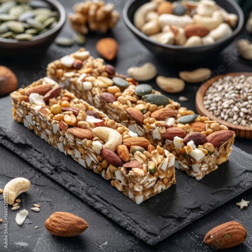 Granola and nut energy bars are displayed on a slate surface, highlighting their wholesome ingredients and rustic appeal. Bowls of nuts and seeds add to the inviting layout