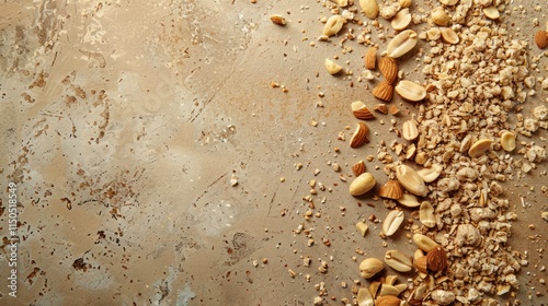 granola, nut, almond, peanut, food, breakfast, healthy, snack, delicious, crispy, texture, beige, background, brown, crumbly, oat, seed, ingredient, nourishment, energy, diet, epicure, tasty, appetising, wholesome, natural, organic, vegan, vegetarian, eat, eating, still life, topview, overhead, sprinkled, scattered