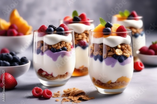 Granola parfait with fresh berries and yogurt in glasses