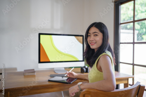 Graphic designer working on digital tablet and computer. Designer Asian Woman artist drawing on graphic tablet Artist Creative Designer sketch graphic drawing creative