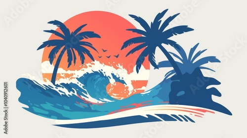 palm tree, ocean, wave, graphic, illustration, orange, blue, red, minimalist, tropical, nature, artistic, vibrant, clean, beach, scenery, design element, summer, coastal, colourful, inviting, creative, cheerful, scenic, relaxed, serene