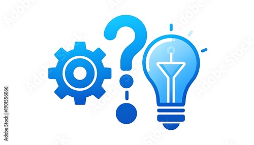 Graphic with gear, question mark, and lightbulb on a white background, in blue gradient