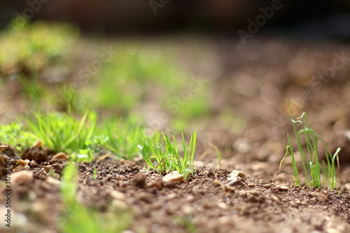 grass, garden, dirtied, dirt, spring, plant, weed, season, seasonal, bloom, green, brown, sunny, sun, light, sunlight, growing, yard, agriculture, selective focus, shallow dof, closeup, closeup, growth, ground, germinating, bokeh, copy space