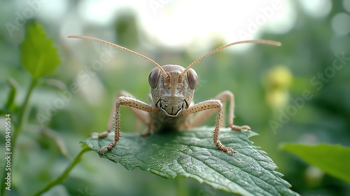 Grasshopper camouflaged on a green leaf, detailed eye and leg structures, soft focus, nature shot