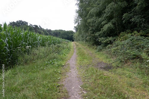 forest, path, cornfield, tree, gravel, nature, landscape, countryside, rural, serene, green, summer, outdoors, environment, trail, pathway, wood, agriculture, farm, crop, corn, maize, plant, leaf, branch, sky, cloud, day, no, people, quiet, peaceful, scenic, idylli