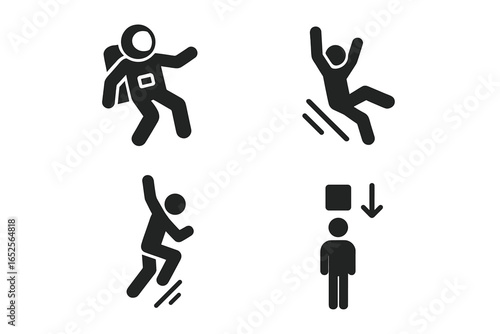 gravity, icon, set, vector, falling, jumping, astronaut, floating, force, physics, motion, slipping, dropping, person, man, human, fall, jump, float, slip, dripped, pictogram, glyphs, symbol, signs, silhouette, graphic, illustration, weightlessness, astronaut, space, action, risk, danger, accident, pressure, leap, balance, imbalance, object