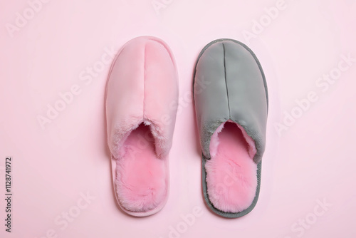 Gray and pink home slippers on a pastel paper background. Top view. Copy space.