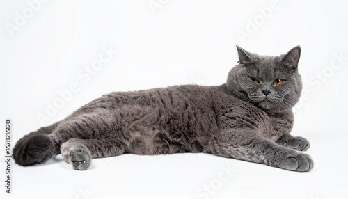 Gray British Shorthair Cat, Relaxed Pose, Fluffy Fur, White Background, Domestic Pet, Cute Animal, F