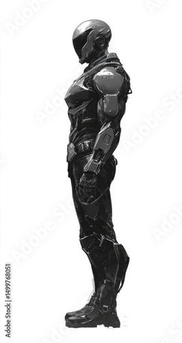 figure, futuristic, armored, suit, grey, profile, side, helmet, character, design, concept, illustration, digital, art, monochrome, black, white, science fiction, fantasy, action, hero, villain, strong, powerful, technology, mechanical, armoring, robotic, metal, tough, weapon, defense, cybernetic, military, speculative, graphic, standing