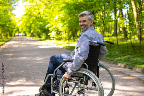 people, caucasian, sitting, accident, equipment, handicap, disability, disabled, nature, outdoors, casual attire, health, medicine, alone, handicapped, mobility, care, guy, grey hair, health care, park, happy, natural, chair, riding, man, disease, medicals, male, positive, person, wheelchair, lifestyle, wheel, adult, happiness
