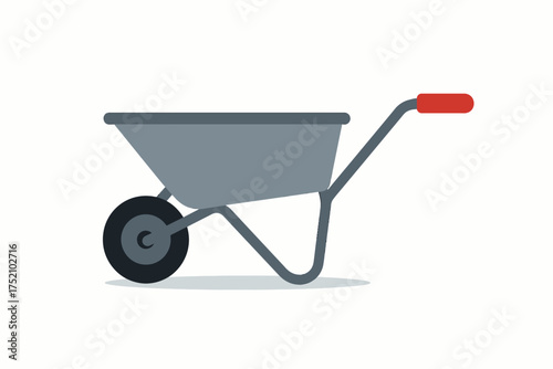 Gray Metal Wheelbarrow Vector, Construction Cart with Red Handle, Side View