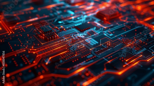 Gray Red Orange Cyan abstract background with digital glowing lights and circuit board elements on a dark blue background, high quality 3D rendered illustration of an abstract futuristic technology