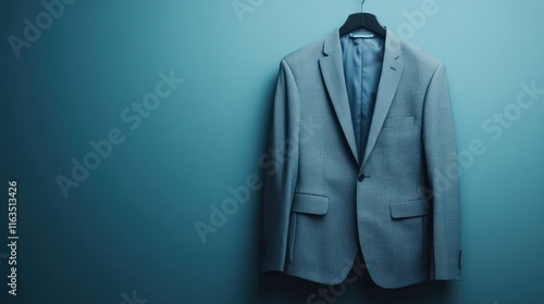 suit, jacket, clothing, apparel, fashion, style, man, male, formal, professional, business, office, wear, attire, garment, textile, fabric, elegant, sophisticated, classic, modern, contemporary, clean, simple, minimalist, background, wall, hanger, teal, grey, colours, texture, design, image, photo, picture, presentation, concept, trend, look, outfit, dress, clothes rack, businessman, attaching, shirt, black, clothes, tuxedo