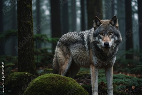 Gray Wolf Standing Tall in a Dense Forest with Mossy Ground